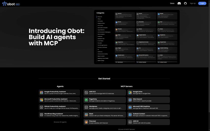 Obot is an open source AI agent platform. Key features include: - Ability to build agents to support a variety of usecases including copilots, assistants, and autonomous agentic workflows. - Integration with leading LLM providers - Built-in RAG for your data - Easy integration with custom or private web services and APIs - OAuth 2.0 authentication